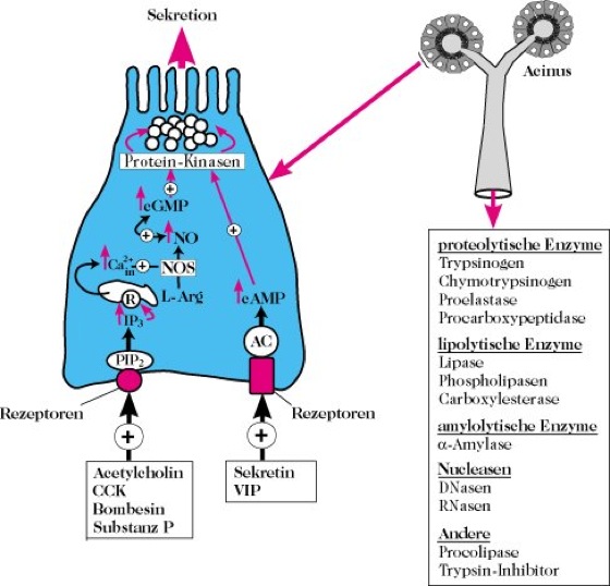 Acinus-Zellen: Enzymsekretion des exokrinen Pankreas und Signaltransduktion in den Acinus-Zellen nach Stimulation mit gastrointestinalen Hormo-nen. AC = Adenylat-Cyclase, cAMP / cGMP = zyklisches Adenosin- / Gua-nosinmonophisphat, IP3 = Inositoltriphosphat, NOS = Stickstoffmonoxid-Synthase, PIP2 = Phosphatidylinositol-4,5-diphophat, R = IP3-Rezeptor. [Quelle: wie oben] Acinus-Zellen