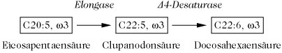 all-cis-4,7,10,13,16,19-Docosahexaensäure, C22 : 6,ω3, E4,7,10,13,16,19-docosahexaenoic acid, DHA, langkettige, sechsfach ungesättigte Fettsäure (Hexaenfettsäuren). DHA ist besonders reichlich in Meeresfischen enthalten (Fischöl), im Organismus ist sie Bestandteil der Phospholipide. Sie wird aus α-Linolensäure über Eicosapentaensäure durch Desaturierung und Kettenverlängerung gebildet (Abb.). Die Reaktion ist reversibel; damit kann bei EPA-Bedarf unabhängig von der Versorgung mit α-Linolensäure auf DHA-Reserven zurückgegriffen werden.