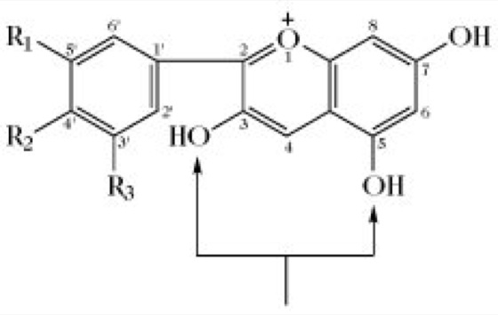 Anthocyane: Glycosylierung des Anthocyanidin-Grundgerüstes an einem oder beiden der markierten Orte mit Glucose, Galactose, Rhamnose oder Arabinose bzw. mit verschiedenen Oligosacchariden ergibt die wasserlöslichen Anthocyane. Anthocyane