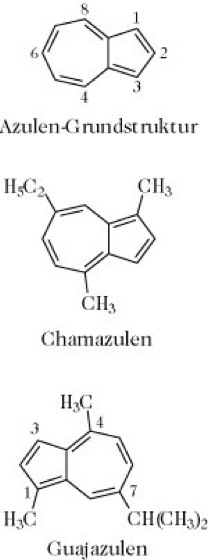 Azulene, Cyclopentacycloheptene, Eazulenes, (von span. azul, blau) blau-violette Aromaten, mit naphthalinähnlichem Geruch, die sich von der Grundstruktur Azulen ableiten (Abb.). Es sind ca. 150 verschiedene Azulen-Verbindungen bekannt, die aus ihren Proazulenen, Bestandteile einiger etherischer Öle, entstehen. Kamille, Schafgarbe und Beifuss gelten als azulenreich. Sie enthalten alkylierte A.-Derivate (Abb.), darunter Chamazulen (7-Ethyl-1,4-Dimethylazulen), Guajazulen (Azulon; 7-Isopropyl-1,4-dimethylazulen) und Vetivazulen. Chamazulen kommt ferner auch in Wermut vor. Besondere Verwendung finden die A. augrund ihrer entzündungshemmenden Wirkung in den sog. Antiphlogistika (Pharmaka, die Entzündungen örtlich oder über die Blutbahn entgegenwirken).