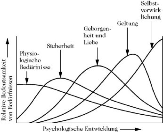 Bedürfnishierarchie, engl. hierarchy of needs, die von Maslow (1971) erstellte hierarchische Anordnung angeborener menschlicher Bedürfnisse. Maslow unterscheidet fünf (später sechs) Motivgruppen (Abb.): 1. physi(ologi)sche Bedürfnisse (z. B. Essen, Trinken, Schlafen), 2. Sicherheit, 3. Liebe und Zugehörigkeit, 4. Wertschätzung, 5. Selbstverwirklichung, (6. Bedürfnis nach Transzendenz). Die Gruppen 1–4 gelten als Mangelmotivation (Edeficiency motivation), die Bedürfnisgruppen 5 (und 6) als Wachstumsmotivation (Egrowth motivation).