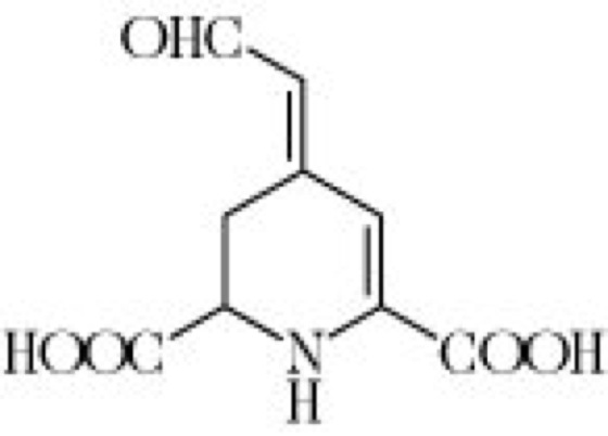 Betalaine, Ebetalains, stickstoffhaltige Pflanzenfarbstoffe, die fast ausschließlich in den Familien der Centrospermen vorkommen. Sie kommen nicht in den gleichen Pflanzenarten vor wie Anthocyane und sind daher von chemotaxonomischem Wert. Die Farbstoffe des Fliegenpilzhuts sind ebenfalls Betalainderivate. Gemeinsamer Strukturbestandteil der B. ist die Betalaminsäure (Abb.). Die wichtigsten Vertreter der B. sind das rote Betanin (Betenrot), Indicaxanthin sowie die orangefarbenen Muscaaurine des Fliegenpilzes. Die roten Farbstoffe (z. B. Betenrot) dieses Strukturtyps werden als Betacyane, die gelben als Betaxanthine bezeichnet.