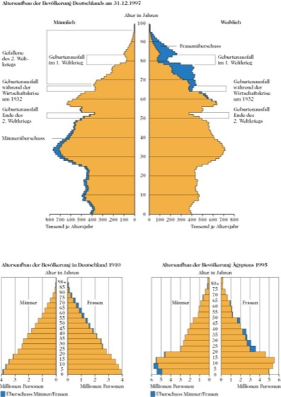 Bevölkerungspyramide: Altersaufbau der Bevökerung Deutschlands am 31.12.1997. Zum Vergleich die Darstellung für Deutschland 1910 (unten links) und Ägypten 1995 (unten rechts). [Quelle: Statistisches Bundesamt] Bevölkerungspyramide