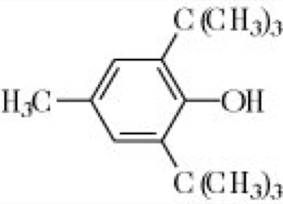 Butylhydroxytoluol (E 321, ADI 0,05 mg, Abb.), BHT, Ebutylated hydroxytoluene, BHT, ist ein Antioxidans, das synergistisch mit anderen Antioxidationsmitteln wirkt, besonders Butylhydroxyanisol und Gallaten. Es hat wegen seiner guten chemischen Stabilität einen starken carry-through-effect. Man benutzt B. bei Fetten und Ölen für die gewerbliche Herstellung von hitzebehandelten Lebensmitteln, Kuchenmischungen, Trockensuppen und -soßen sowie Kaugummi. Da BHT die Synthese von Verdauungsenzymen in der Leber fördert, wird z. B. der Abbau von Vitamin D beschleunigt. Bei Allergie gegen BHT können Hautrisse auftreten. Säuglings- und Kleinkindnahrung darf BHT nicht zugesetzt werden.