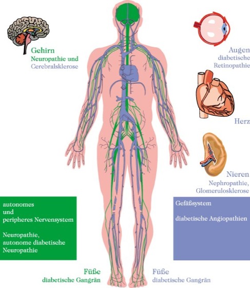 diabetische Folgeerkrankungen: Spätkomplikationen des Diabetes mellitus und die betroffenen Organe / Organsysteme. Der Übersichtlichkeit halber ist das arterielle Gefäßsystem im Körperschema ausgeblendet. diabetische Folgeerkrankungen
