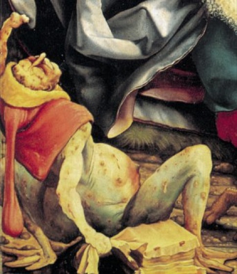 Ergotismus: Ausschnitt aus „Die Versuchung des heiligen Antonius”. Gemälde des Isenheimer Altars von Mathias Grünewald (ca. 1475–1528). [„Musée d'Unterlinden, Colmar, Frankreich, Photo O. Zimmermann] Ergotismus