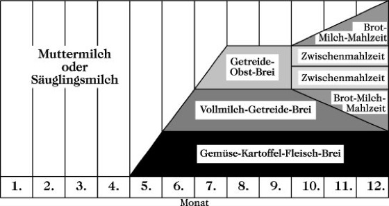 In den ersten 4–6 Lebensmonaten sind außer Muttermilch oder Säuglingsanfangsnahrung keine weiteren Lebensmittel notwendig. Danach wird im Abstand von ca. einem Monat jeweils eine Milchmahlzeit nacheinander durch einen Gemüse-Kartoffel-Fleisch-Brei, einen Vollmilch-Getreide-Brei und einen Getreide-Obst-Brei ersetzt. Ungefähr ab dem 10. Lebensmonat gehen die Breimahlzeiten in die 3 Haupt- und 2 Zwischenmahlzeiten der Familienkost über. Mit dieser Zusammenstellung wird eine bedarfsgerechte Tageszufuhr von Energie und Nährstoffen erreicht. Die Beikost kann selbst zubereitet oder in Form entsprechender industriell hergestellter Beikost gegeben werden.