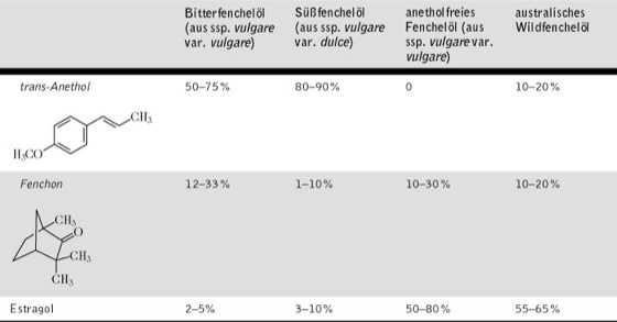 Fenchelöl, Efennel oil, etherisches Öl aus den Samen des Fenchels. Die Zusammensetzung einiger Komponenten ist stark abhängig von der Varietetät der Herkunftspflanze (Tab.). Neben den in der Tabelle aufgeführten Inhaltsstoffen enthält F. Limonen, α-Pinen, Camphen, p-Anisaldehyd u. a. Neben den beim Stichwort Fenchel beschriebenen therapeutischen Anwendungen – z. T. auch einzelner Komponenten – werden Fenchelöl und trans-Anethol auch in der Aromenindstrie genutzt, z. B. für Zahncremes, Seifen, Backwaren, Wurst, Süßwaren und Liköre.