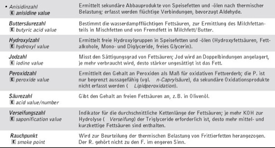 Fettkennzahlen, Kriterien zur Unterscheidung und Qualitätsbeurteilung von Speisefetten und      -ölen. Neue analytische Verfahren haben die F. in der Laborpraxis verdrängt; die in der Tab. zusammengestellten werden teilweise noch verwendet und in der Literatur zitiert.