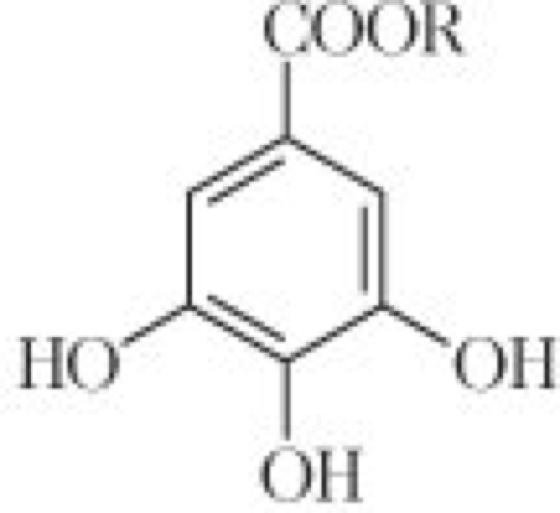 Gallate: R = H: Gallussäure, R = –C3H7: Propylgallat, R = –C8H17: Octylgallat, R = –C12H25: Dodecylgallat Gallate