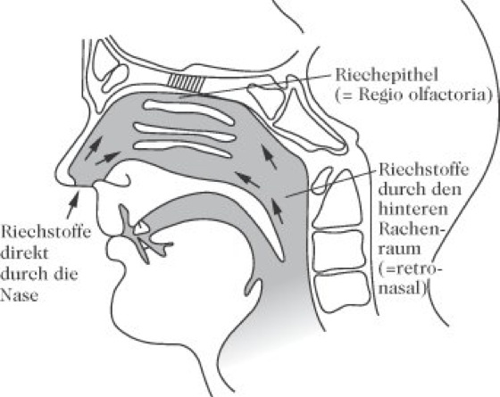 Geruch, olfaktorischer Eindruck, Eodo(u)r, smell, olfactory impression, Sinneseindruck, der im oberen Teil der Nasenhöhle, im Riechepithel (Regio olfactoria) erfolgt. Das Riechepithel ist ein 5–10 cm2 großer Teil der Nasenschleimhaut, der mit 3–50 Mio. Riechzellen (Geruchszellen) besetzt ist. Flüchtige Aromastoffe (Duftstoffe) gelangen zu den Riechzellen entweder mit der Atemluft direkt durch die Nase (direkter Geruch = nasaler Geruch) oder indirekt über den hinteren Rachenraum (retronasaler Geruch), wo sie beim Kauen von Lebensmitteln durch Zerkleinern, Durchspeicheln und Erwärmung flüchtig werden (Abb.). Bestimmte Atemtechniken können die Geruchsempfindlichkeit erhöhen. Die Reaktion auf direkten G. ist – Zusammen mit den Wahrnehmungen der anderen Sinne – ein im Laufe der Evolution entwickeltes Auswahlkriterium für Nahrung (finden von geeigneter bzw. Ablehnung von ungeeigneter, v. a. verdorbener Nahrung). Der Mensch kann 2000–4000 Geruchseindrücke unterscheiden, mit zunehmendem Alter lässt die Fähigkeit zur Geruchserkennung nach. Es gibt mehr als 17.000 Riechstoffe. Wie auch bei anderen Sinnesorganen (Sinne) tritt beim G. das Phänomen der Adaptation auf. Das Zusammenwirken von Geschmack und G. kann im Aromagramm aufgeschlüsselt werden.