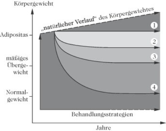 4 = Gewichtsnormalisierung (sehr selten). [Nach F. Rössner, Factors determining the long-term outcome of obesity treatment. In: P. Björntorp u. G.N. Berodoff (ed.) Obesity, JB Lippincott Co. Philadelphia, 1992, pp 712–719] Gewichtskurve