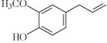 Gewürznelke, bot. Syzygium aromaticum, Eclove, u. a. auf Sansibar und Madagaskar als Gewürzpflanze angebauter immergrüner Baum (Myrtengewächse), dessen als Gewürz verwendete getrocknete Blütenknospen und junge Früchte (Mutternelken) ein brennend scharf schmeckendes etherisches Öl (Nelkenöl, mit bis zu 95 % Eugenol, Abb., daneben Acetyleugenol und β-Caryophyllen) enthalten. G. werden u. a. für die Zubereitung von Kompott, Fleischgerichten und Weihnachtsgebäck verwendet.