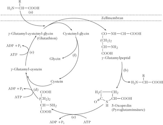 Glutathion, γ-L-Glutamyl-L-cysteinyl-glycin, GSH, Eglutathione, ein im menschlichen Organismus vorkommendes Tripeptid mit zentraler Rolle im Abwehrsystem. GSH wird in der Zelle in zwei Schritten gebildet: aus L-Glutaminsäure und L-Cystein entsteht das Dipeptid γ-L-Glutamyl-L-cystein, das mit Glycin zu G. umgesetzt wird. Die Synthese von G. ist Teil des γ-Glutamyl-Zyklus (postulierter Mechanismus des Aminosäurentransportes [Abb.]). Da L-Glutaminsäure nur sehr eingeschränkt die Zellmembran passiert, wird L-Glutamin aus der Blutbahn aufgenommen und im Cytosol desamidiert.