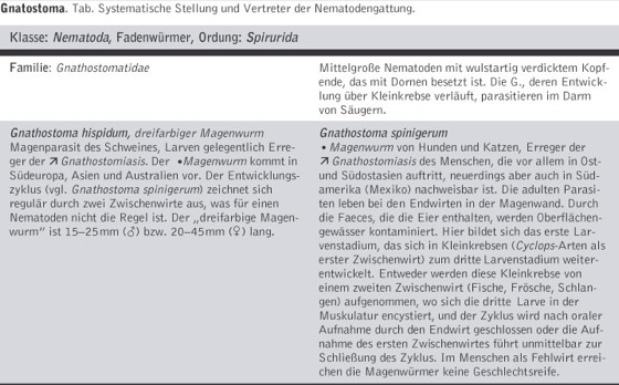Gnathostoma, Gattung der Familie der Gnathostomatidae, Ordnung der Spirurida der Klasse der Nematoden (Nematoda). Mittelgroße bis 50 mm lange Würmer im Magen von Vertebraten, die Erreger der Gnathostomiasis (Tab.).