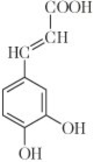 Kaffesäure, Ecaffeic acid, 3,4-Dihydroxyzimtsäure, ein sekundärer Pflanzenstoff aus der Gruppe der Hydroxyzimtsäuren (Abb.). K. ist, neben der Hydroxyzimtsäure Ferulasäure, der sekundäre Pflanzenstoff, der am häufigsten in der menschlichen Nahrung vorkommt. Weit verbreitete Ester der K. sind die Chlorogensäuren (Esterbindung mit Chinasäure). Chlorogensäure kommt vor in rohen und gerösteten Kaffeebohnen, vielen Obstarten (z. B. Äpfel, Aprikosen, Birnen, Heidelbeeren, Kirschen, Kiwi, Pfirsiche, Pflaumen, Trauben), vielen Gemüsearten (z. B. Möhren, Sellerie, Tomaten, Gurken, Artischocken, Auberginen, Endivie, Kopfsalat), Kartoffeln, Kakao, Tee. Hauptquelle für die Kaffeesäure ist der Kaffee. Eine Tasse (200 ml) Instantkaffee enthält z. B. 50–150 mg Chlorogensäure. Beim Rösten des Kaffees entstehen aus K. niedere Phenole und zwei Phenylindane in kleinen Mengen. Was aus dem Hauptteil wird, ist unbekannt. K. besitzt antioxidative Eigenschaften, sie hemmt z. B. die Lipid(per)oxidation (v. a. LDL und Retinsäure) und soll die Hydroxylradikalbildung erniedrigen.