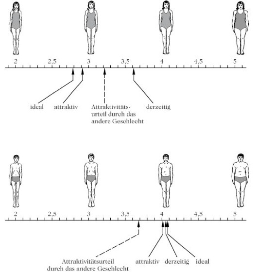 Körperschema: Skalenbewertung von Figuren. Selbsteinschätzung von weiblichen (oben) und männlichen (unten) Probanden anhand der vorgegebenen Skala: Mittlere Werte für die derzeitige eigene Figur, die als ideal angesehene Figur und die mutmaßlich für das andere Geschlecht attraktivste Figur: Der gestrichelte Pfeil zeigt den mittleren Skalenwert für Frauen, den Männer am attraktivsten finden (oben), bzw. für Männer, den Frauen am attraktivsten finden (unten). [n. Fallon u. Rozin, 1985, aus: A.W. Logue, Die Psychologie des Essens und Trinkens, Spektrum Akademischer Verlag, Heidelberg, 1995] Körperschema