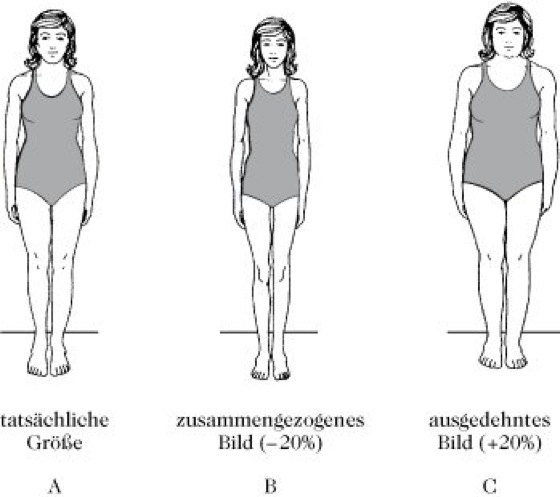 Körperschemastörung, Ebody image disorder, Entwicklung eines Körperschemas, das sich von den tatsächlichen Körpermaßen deutlich unterscheidet. K. sind typisch für Patienten mit Anorexia nervosa. Diese nehmen sich auch mit extrem ausgemergeltem Körper noch als „nicht zu dünn“, „gerade richtig“ oder sogar „immer noch zu dick“ wahr. In Versuchen mit optisch / elektronisch verzerrten Fotografien (Fotoverzerrtechnik) werden z. B. Fotos des eigenen Körpers breiter als in natura eingestellt, Fotos anderer Personen werden hingegen normal eingestellt (Abb.). Die richtige Vorstellung über den eigenen Körper ist eine Vorbedingung für die Heilung der Magersucht.