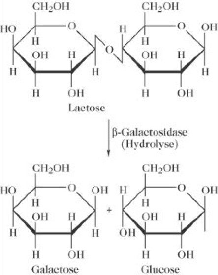 Lactase: Hydrolyse von Lactose zu Galactose und Glucose. Lactase