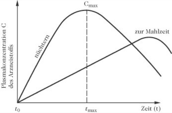 Nahrungsmittel können die Pharmakokinetik und -dynamik von Arzneistoffen gravierend verändern und sich damit entscheidend auf den Erfolg einer Therapie auswirken. Derartige Einflüsse zeigen sich an der Bioverfügbarkeit, die anhand der Fläche unter der Plasmaspiegel-Zeit-Kurve (Earea under the plasma concentration-time curve,AUC) deutlich wird. Veränderungen der Absorptionsgeschwindigkeit durch Nahrung können u. U. zu einem flacheren oder steileren Kurvenverlauf führen und sich damit auf das Erreichen und die Aufrechterhaltung der wirksamen Plasmakonzentration auswirken (Abb. 3).