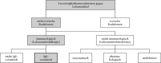 Lebensmittelallergie: Einteilung der Unverträglichkeitsreaktionen auf Lebensmittel nach den Empfehlungen der Europäischen Akademie für Allergologie und klinische Immunologie. [veränd. n. L. Jäger u. B. Wüthrich: Nahrungsmittelallergien und Intoleranzen, Gustav Fischer, Ulm, 1998]. Lebensmittelallergie