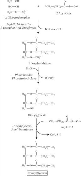 Die weitere Synthese geschieht in drei Schritten, wie in der Abb. gezeigt. Die beteiligten Enzyme bilden einen an die Membran des endoplasmatischen Reticulums gebundenen Multi-Enzym-Komplex (Triacylglycerin-Synthetase-Komplex).
