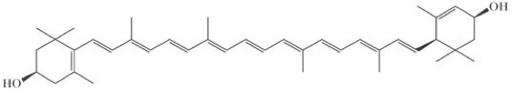 Lutein, (E 161 b), β, ℇ-carotin-3, 3'-diol, Elutein, ein gelb-orangefarbenes Carotinoid aus der Gruppe der Xanthophylle (Abb.). Der sekundäre Pflanzenstoff kommt als Pflanzenfarbstoff häufig zusammen mit Zeaxanthin vor. L. besitzt keine Provitamin-A-Aktivität und wurde erstmals als Hauptfarbstoff des Eidotters isoliert. Es kommt in grünen Blättern, gelben Blüten und Algen vor. L. hemmt als Antioxidans die Lipidperoxidation und wird als Farbstoff E 161 b (aus Eigelb) vor allem in der Back- und Süßwarenindustrie verwendet.
