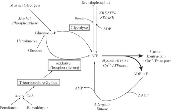 Stoffwechsel: Energieverbrauchend sind sowohl die Bewegungsabläufe der Muskeproteine als auch die Regulation der Calciumkonzentrationen in den Kompartimenten der M., welche durch ATP-getriebene Ionenpumpen erfolgt. Hierfür kann die M. verschiedene ATP-Quellen nutzen (Abb.):