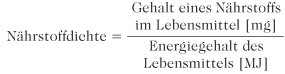 Nährstoffdichte, Enutrient density, Begriff der die Beziehung zwischen dem Energiegehalt (Brennwert) pro Gewichtseinheit (z. B. 100 g) eines Lebensmittels und dem Gehalt eines bestimmten Nährstoffs ausdrückt (Abb.). Die N. ist in bestimmten Lebensabschnitten (Wachstum, Schwangerschaft, höheres Alter [vgl. Senioren-Ernährung]) von besonderer Bedeutung, wo weniger die Energiezufuhr als die ausreichende Versorgung mit kritischen Nährstoffen zu beachten ist. Vgl. Energiedichte.