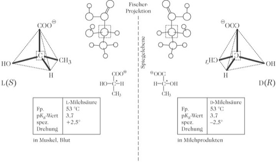 Opt. Isomere haben mit Ausnahme der optischen Drehrichtung und der Reaktion mit anderen chiralen Molekülen gleiche chemische und physikalische Eigenschaften (z. B. Siede- und Schmelzpunkt, Löslichkeit). Ihre physiologischen Eigenschaften, z. B. ihre pharmakologische und toxikologische Wirkung, ihre Reaktion mit Enzymen oder ihre sensorischen Eigenschaften unterscheiden sich jedoch z. T. erheblich. Ein typisches Beispiel dafür ist die rechts- und linksdrehende Milchsäure (Abb. 2). Sie kann zwei verschiedene Formen einnehmen, die sich wie Bild und Spiegelbild, also wie Enantiomere verhalten. Die L(+)-Milchsäure (rechtsdrehend) kommt im Körper vor. Sie kann aus Pyruvat, dem Endprodukt der Glycolyse, entstehen und von der Leber leicht umgesetzt werden. Sie wird auch von den bei der Jogurtherstellung verwendeten Milchsäurebakterien (Streptococcus thermophilus zu 100 %, vom Lactobacillus acidophilus zu 50 %) und von bestimmten Bifidus-Bakterien zu 95 % gebildet. Die D(–)-Milchsäure (linksdrehend) wird ebenfalls von Mikroorganismen produziert und kommt in Sauermilchprodukten, die z. B. mit Lactobacillus bulgaricus hergestellt wurden, vor. Sie kann im menschlichen Organismus nur langsam abgebaut und ausgeschieden werden. Bei einem hohen Verzehr dieser Milchsäure kann es deshalb zu einer Übersäuerung des Blutes kommen. Die WHO empfiehlt deshalb, täglich nicht mehr als 100 mg linksdrehende Milchsäure pro kg Körpergewicht aufzunehmen, also nicht mehr als 1 kg Jogurt. Säuglingen sollte man keine Sauermilchprodukte mit linksdrehender Milchsäure vor Ende des ersten Lebensjahres verabreichen.