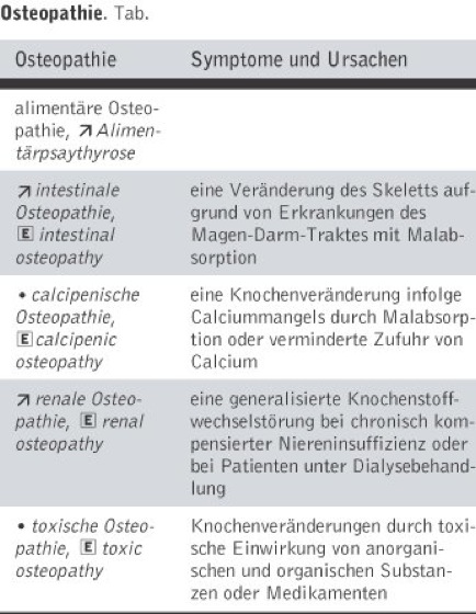 Osteopathie, Eosteopathy, allg. Bezeichnung für eine Knochenerkrankung. Ursachen können prinzipiell verminderte enterale Calciumresorption oder erhöhte renale Calciumverluste sein sowie generell Beeinträchtigung des Knochenstoffwechsels. Es werden verschiedene Formen der O. unterschieden (Tab.).