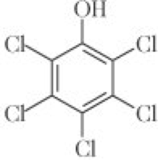 Pentachlorphenol, PCP, C6Cl5OH (Abb.), ist ein starkes Gift für Mikroorganismen (Bakterizid, Fungizid), Pflanzen (Algizid, Herbizid), Insekten, Mollusken und Fische. Es stört die oxidative Phosphorylierung (Atmungskette) in der Zelle. P. kann v. a. über die Haut aber auch intestinal oder durch Einatmen aufgenommen werden und führt bei Säugern zu erhöhter Temperatur, beschleunigter Atmung, Blutdruckanstieg, Hyperglycämie und Herzversagen. Die Ausscheidung erfolgt nach Glucuronidierung in der Leber vorrangig über die Nieren. Als minimale letale Dosis bei oraler Aufnahme gelten 30 mg / kg KG. Sowohl technisches, Verunreinigungen enthaltendes (v. a. Dioxine), als auch gereinigtes P. gelten als embryotoxisch und cancerogen. Es ist als krebserzeugend Kategorie 2 eingestuft.