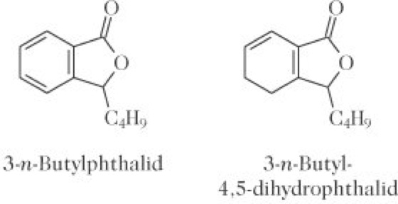 Phthalide, Ephthalides, sekundäre Pflanzenstoffe mit dem von der Phthalsäure abgeleiteten Lacton-Grundgerüst Isobenzofuran-1-on. P. kommen als charakteristische Aromastoffe in etherischen Ölen von Sellerie und Liebstöckel (Apiaceae / Umbelliferae) vor. Hauptsächlich wurde das P. 3-n-Butylphthalid und das Dihydrophthalid Sedanolid (3-n-Butyl-4,5-dihydrophthalid) nachgewiesen (Abb.). Zum Wirkmechanismus der P. beim Menschen ist bisher wenig bekannt. Im Tierversuch konnten beide Verbindungen die Aktivität des Entgiftungsenzyms Glutathion-S-Transferase (EC 2.5.1.18) in der Leber und der Dünndarmmucosa erhöhen und das Wachstum chemisch induzierter Tumore hemmen. P. werden daher als chemopräventive Verbindungen (Chemoprävention) diskutiert.
