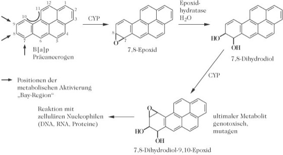 polyzyklische aromatische Kohlenwasserstoffe: Biotransformation von Benzo[a]pyren (B[a]p). Bay-Region: Ein buchtförmiger Bereich im PAK-Molekül, der nach bisherigen Erkenntnissen dazu beiträgt, dass diese Moleküle potentere Procarcinogene sind als jene, denen sie fehlt. So wirkt z. B. Phenanthren stärker carcinogen als Anthracen und Benz[a]pyren ist ein potenteres Carcinogen als Benz[c,d]pyren. Die eigentlichen Carcinogene sind die Epoxide der PAK, die mit Hilfe von Cytochrom P450 (CYP) gebildet werden. Die stärkste carcinogene Wirkung geht von den Epoxiden aus, die am Rand der Bay-Region liegen. Das heißt, das entscheidende Carcinogen, das auf metabolischem Weg aus Benz[a]pyren gebildet wird, ist das 7,8-Diol-9,10-epoxid. Die carcinogene Wirkung beruht auf der Alkylierung von DNA (DNA-Addukte). polyzyklische aromatische Kohlenwasserstoffe