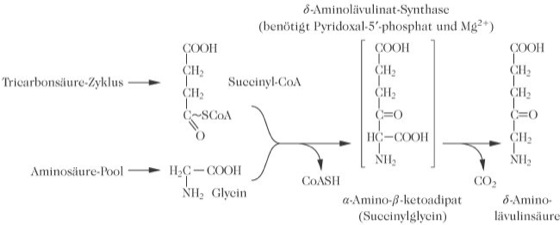 Porphyrinstoffwechsel: Abb. 1. Der Geschwindigkeits-bestimmende Schritt der Porphyrinsynthese, katalysiert durch das Enzym δ-Aminolävulinsäure-Synthase. Die Zwischenverbindung in Klammern (Succinylglycin) wurde nicht zweifelsfrei nachgewiesen. Kondensation und Decarboxylierung können gleichzeitig ablaufen. Porphyrinstoffwechsel