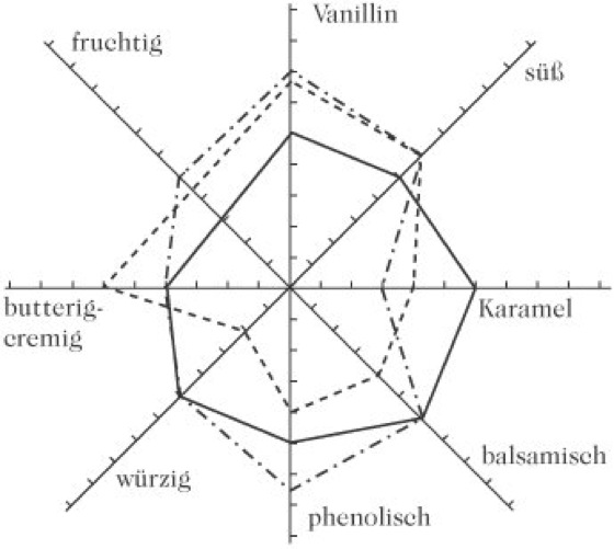 Die Ergebnisse von Flavor-Profil-Methode und QDA werden in der Regel als Spinnennetz-Darstellung dokumentiert (Geschmacksprofil; Geruchsprofil; Konsistenzprofil) Die Abb. zeigt als Beispiel die Ergebnisse der Flavor-Profil-Methode bei drei Vanillearomen.