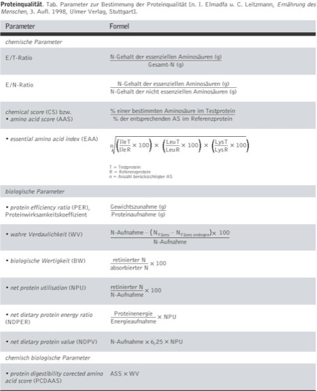 Proteinqualität: Tab. Parameter zur Bestimmung der Proteinqualität [n. I. Elmadfa u. C. Leitzmann, Ernährung des Menschen, 3. Aufl. 1998, Ulmer Verlag, Stuttgart]. Proteinqualität