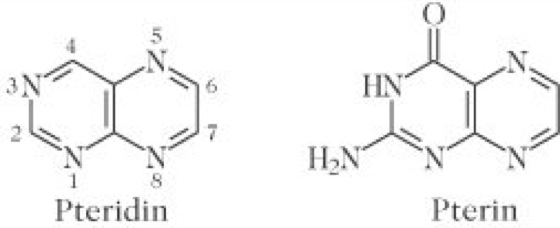 Pteridine, Epteridines, eine Gruppe von Verbindungen, die das Pteridinringsystem enthalten (Abb.). Der Grundkörper der meisten natürlich vorkommenden P. ist das Pterin (Abb.). Sowohl Folsäure als auch Tetrahydrobiopterin sind P. und dienen als Cofaktor der Wasserstoffübertragung. Für Säugetiere stellt Folsäure ein Vitamin dar, dagegen sind sie fähig, Tetrahydrobiopterin zu synthetisieren. Diese beiden Verbindungen werden trotz ihrer chemischen Ähnlichkeit auf unterschiedlichen Wegen gebildet.