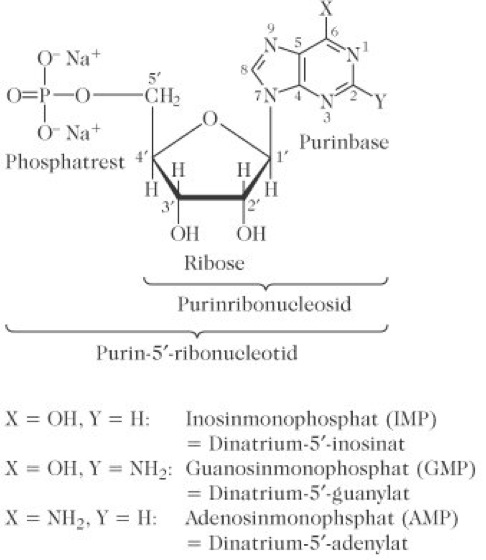 Lebensmitteltechnologische Bedeutung: P. sind eine Gruppe wichtiger Geschmacksverstärker (Calcium-P.: E 634, Dinatrium-P. E 635; Flavor-modifizierende Substanzen), sie zählen zu den Umami-Substanzen (Umami). Industriell bedeutsam sind Inosinmonophosphat (IMP, als Dinatrium-5‘-Inosinat) und Guanosinmonophosphat (GMP, als Dinatrium-5‘-Guanylat). Weniger bedeutsam ist das Adenosinmonophosphat (AMP, als Dinatrium-5‘-Adenylat). Typische Anwendungsgebiete von IMP und GMP sind Suppen, Saucen, Dressings, Fertiggerichte, Fleisch- und Fischprodukte, Snacks und Gemüseprodukte (Dosierung: 0,001 bis 0,150 % im verzehrsfertigen Lebensmittel). Eine 1 : 1-Mischung aus IMP und GMP wird unter dem Handelsnamen Ribotide® vertrieben und von der Industrie eingesetzt. IMP und GMP wurden ursprünglich aus natürlichen Quellen isoliert. Heute werden sie fermentativ gewonnen, vor allem mit Brevibacterium ammoniagenes.