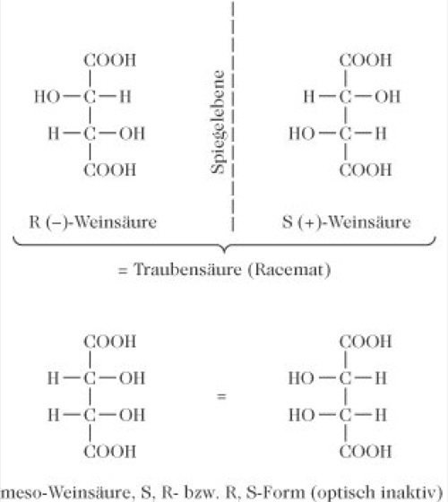 Man erkennt ein R,R(–)/S,S(+)-Enantiomerenpaar (oben) und ein R,S/S,R-Paar (unten). Letzteres scheint auf den ersten Blick auch ein Enantiomerenpaar zu sein, lässt sich jedoch durch Drehung um 180° zur Deckung bringen. Somit stellt es zwei identische Verbindungen dar. Sie besitzen eine interne Spiegelebene und sind damit achiral und optisch inaktiv. Solche Verbindungen nennt man meso-Verbindungen. Meso-Verbindungen sind also Verbindungen mit mehreren Chiralitätszentren, die mit ihrem Spiegelbild in Deckung gebracht werden können. Sie stellen optisch inaktive innermolekulare R. dar. Die R,R- oder die S,S-Weinsäure für sich verhalten sich zur R,S- (bzw. zur S,R-) meso-Form diastereomer (optische Isomerie).