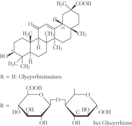 Saponine: Formelbeispiel: Glycyrrhizinsäure (Aglycon) und Glycyrrhizin (Saponin). Saponine