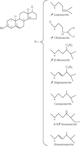 Sterine: Strukturformeln von Sterinen. Der Stern markiert den Bindungsort des Restes R an das Ringsystem. Sterine