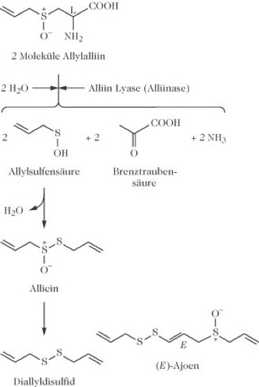Sulfide: Bildung von Diallylsulfid (in Knoblauch und anderen Allium-Arten) nach der Verletzung von Zellen. Alliin wird zunächst zu Brenztraubensäure und Allylsulfensäure hydrolysiert. Letztere wird in Allicin umgewandelt. Hieraus können Diallyldisulfid und Ajoen gebildet werden. Sulfide