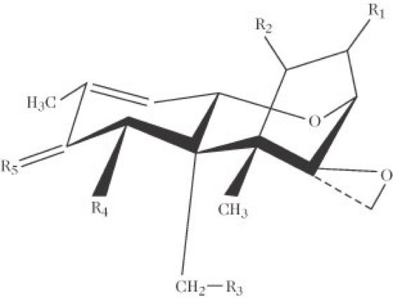 Trichothecene, Etrichothecenes, wichtigste Vertreter der Fusariumtoxine, eine Gruppe von Sesquiterpenen aus verschiedenen auf Getreide wachsenden Schimmelpilzen (Fungi imperfecti, z. B. Fusarium tricintum oder Trichoderma-, Stachybotis-Arten). Nach strukturellen Differenzen werden vier Untergruppen unterschieden. Allen gemeinsam ist eine Epoxidgruppe am C12,13 sowie eine Doppelbindung am C8,9 (Abb.). Die T. wirken antibakteriell, antifungizid, insektizid, antiviral und cytostatisch. Sie sind mehr oder weniger giftig, wobei die Toxizität nach Verbindung und Tierart stark differiert (LD50 0,5–1.000 mg / kg). Sie nimmt in der Reihenfolge Maus, Ratte, Kaninchen, Meerschweinchen zu. Für den Mensch muss mit einer noch höheren toxischen Potenz gerechnet werden. T. hemmen die Proteinbiosynthese in Säugetierzellen und haben als wichtige Vertreter der Mycotoxine zu zahlreichen Vergiftungen bei Mensch und Tier geführt (Brechreiz, blutige Durchfälle, Appetitlosigkeit, Ataxie, Leukocytose und nachfolgend schwere Leukopenie, Entzündungen des Magen-Darm-Traktes, Zerstörung von Nervenzellen des ZNS, Hämorrhagien des Herzmuskels, Läsionen von Testes, Thymus und Lymphknoten). Einige Vertreter wirken teratogen.