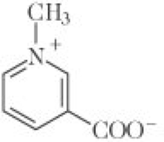 Trigonellin, 1-Methylnicotinsäure, Etrigonellin, ein Metabolit des Niacins (Abb.), der in vielen Pflanzen (z. B. Bockshornklee, Kaffeestrauch) gefunden wurde. T. fungiert als Speicherform der Nicotinsäure. Bei Tieren und dem Menschen ist T. vermutlich kein Nicotinsäure-Metabolit, obwohl es im Urin von Kaffeetrinkern vorkommt. Grüne Kaffeebohnen enthalten relativ große Mengen an T. (<500 mg/kg). Beim Rösten der Kaffebohne wird T. in Nicotinsäure umgewandelt. In Süd- und Zentralamerika ist Kaffee eine wichtige Nahrungsquelle für Nicotinsäure.