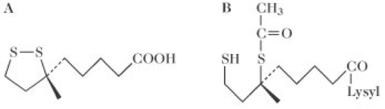 a-Liponsäure: A: (3R)-1,2-Dithiolan-3-pentancarbonsäure, die oxidierte Form der Liponsäure; B: 6S-Acetyl-6,8-Dithiolactonsäure. Das Acetylderivat der reduzierten Form der Liponsäure ist über eine Amidbindung mit der e-Aminogruppe eines Lysinrests an ein Enzymprotein gebunden. a-Liponsäure