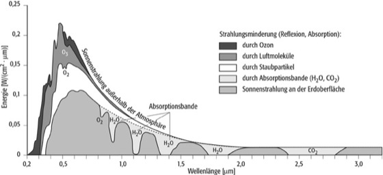 Absorptionsbanden 1: Absorptionsbanden 1: Veränderung der spektralen Verteilung der Sonnenstrahlung beim Durchgang durch die Atmosphäre.