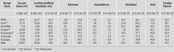 13,73 Mio. km2 oder 10,3 % der Festlandsfläche werden als Ackerland genutzt, während auf das sog. Dauergrünland 33,98 Mio. km2 entfallen. Darunter ist vorwiegend extensiv genutztes Weideland zu verstehen. Lediglich 10-12% des Dauergrünlandes besteht aus gedüngtem und z.T. melioriertem Kulturgrasland. Gleichzeitig werden 28% des Ackerlandes (4 Mio. km2) zur Produktion von Ackerfutter für die tierische Veredelung eingesetzt. Berücksichtigt man noch die Nebenprodukte der pflanzlichen Produktion, die in der Tierernährung eingesetzt werden (u.a. Stroh, Rübenblatt, Ölkuchenschrote, Treber, Melasse), so sind ca. 3/4 des gesamten Agrarraums der Erzeugung tierischer Produkte gewidmet. Hinsichtlich bislang noch nicht genutzter Reserven an potenziellem Ackerland geht die FAO von zusätzlichen 3,5 Mio. km2 aus. Davon entfallen 48% auf Lateinamerika und 44% auf das subsaharische Afrika. Südasien und der Vordere Orient verfügen kaum noch über Landreserven. Etwa die Hälfte des zusätzlichen Flächenpotenzials ist mit Wald bestockt, dessen Rodung aus ökologischen Gründen problematisch ist. Weitere Teile sind Gebirgsland oder tragen ertragsarme Böden. Realistisch erscheint der FAO eine Ausweitung der landwirtschaftlichen Nutzfläche bis zum Jahre 2010 um lediglich 90 Mio. ha. Daraus ergibt sich die Notwendigkeit, den Nahrungsbedarf der zunehmenden Weltbevölkerung ganz überwiegend aus Ertragssteigerungen zu decken.