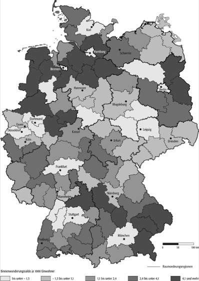 Altenwanderung, Wohnungswechsel älterer Menschen. Längere Lebenserwartung und relativ sichere Renten formen den Ruhestand als einen markanten eigenen Lebensabschnitt, für den es sich lohnt an einen geeigneten Wohnort zu ziehen (Ruhesitzwanderer). Weiterhin erhöht der zunehmende Anteil älterer Menschen als Folge niedriger Fruchtbarkeit die Bedeutung der mindestens 65-Jährigen für das Wanderungsgeschehen. In der Abb. verzeichnen die Agglomerationen und Regionen mit Aufnahmelagern für Aussiedler Wanderungsverluste, während weniger dicht besiedelte Räume Wanderungsgewinne registrieren. Hinsichtlich ihres Gesundheitszustandes unterscheiden sich "junge Alte" von "alten Alten". Als Wanderungsziele wählen ältere Menschen dementsprechend die Nähe zu Freunden oder Verwandten, die sich evtl. um sie kümmern können, Gebiete in denen sie aufgewachsen sind oder klimatisch und landschaftlich attraktive Regionen mit hoher Lebensqualität wie der Küstenbereich, das Alpenvorland oder ausgewählte Mittelgebirge. Vergleichbare interregionale Wanderungen sind in den USA (Florida, Südwesten), in Frankreich (Mittelmeerküste) oder in England (Cornwall, East Anglia) zu beobachten.