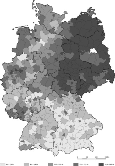 Das regionale Muster differenziert die generelle Aussage einer Ost-West-Dichotomie. Die Arbeitslosenquote ist in den neuen Ländern generell höher, wenn auch nicht überall. In den Umlandkreisen um Berlin und in Potsdam ist die Arbeitslosigkeit bereits deutlich gesunken. Was sich damit zeigt, kann auch in Zukunft erwartet werden: Im Zentrum und an der westlichen Peripherie der ehemaligen DDR kann am ehesten mit einer positiven Nachfrageentwicklung und damit mit einem Sinken der Arbeitslosenquote gerechnet werden.